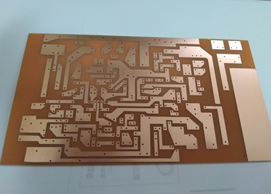 | 正式な基板の製作の前に試作基板を基に若干の変更を加えました。 いつものシール用はがせるフィルムにプリンターでパターンを印刷しカッターナイフで切り出します。 方チャンネル2日、計4日で終了。 エッチング後に無洗浄タイプのフラックスで防錆します。 |