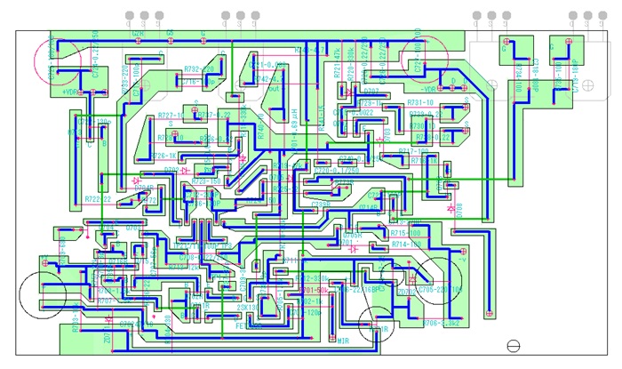 基板パターンをCADで作りました。 パターンはオリジナルのコピーではなく使用する予定の部品に合わせたり、パターンの簡素化をしてみました。 ジャンパー線を何本か追加したことでだいぶパターがすっきりしてきます。 簡素化する事でパターンの線を太くすることができ、またパターン間隔を広げることができるので、プリント基板の自作がしやすくなるはずです。 部品の配置はオリジナルを極力維持します。 |