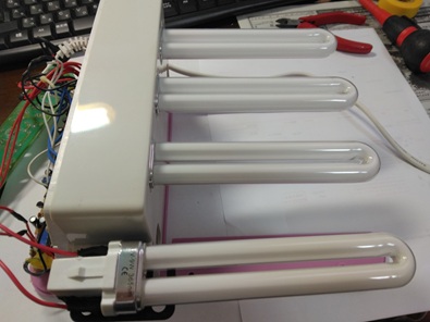 | プリント基板を感光基板で製作するにあたって露光装置の製作を行いました。 光源はUVライトとするためにオークションでネイルに使う器具をゲットしました。 5歩なるランプのうち1本が点灯不能とのことで100円で落札(送料900円かかりましたが)。 廃部の面積が狭いので、これをベースに改造します。 |