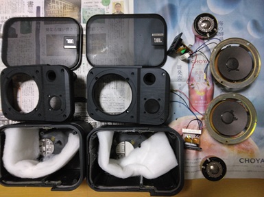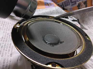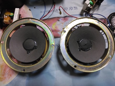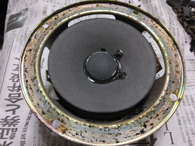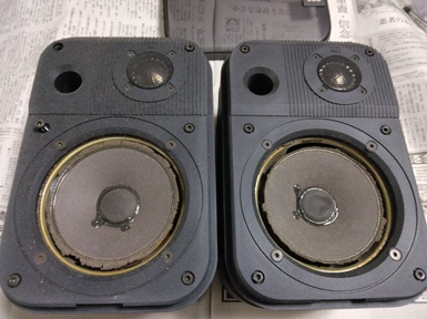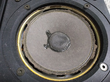 とりあえず分解してユニットを取り外してみました。 ツイーターのダイヤフラムは粘着テープで引っ張りながら修正し何とか実用になりそうです。 ウーハーはウレタンエッジが触るとボロボロと取れる状態です。 心配していたボイスコイルは何とか生きているようです。 片側はセンターキャップがへこんでいますが少し修正してやりましょう。