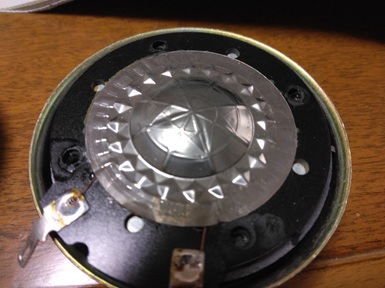 京セラのA-710というアンプのジャンク品を購入したとき、動作確認に使ったのですが型チャンネルのDC漏れをもろに受けました。 これは焼いてしまったと思い納戸の隅に。 その後ツイーターを使おうかと分解したときに手が滑ってボックス内に転がってしまい、ダイアフラムが少し変形してしまいました。