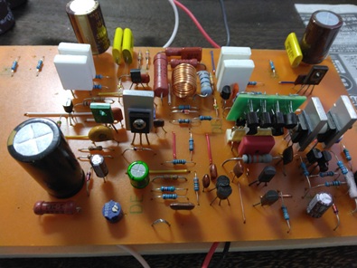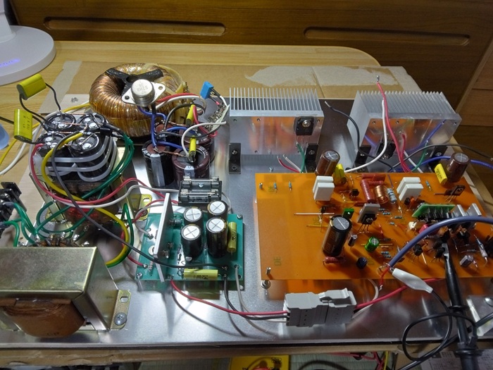 最初正弦波を入れてみた段階では若干寄生発振が見られる程度でしたが、だんだん発振の程度がひどくなり、プローブでいろいろなところを触ると様々な波形が出てきます。 位相補償のコンデンサの容量をいくつか増やしてみても変化なし。 基本的な問題があるようです。 バラック状態での試運転で、シャーシアースも無い状態であり、照明に使っている安物のLEDスタンドも何かノイズを振りまいている感じもします。 それに電源の配線も長いし。 こんな適当な状況で試運転すること自体が無謀なのかもしれません。 しかし、一応動作はしており音も出て、正弦波、方形波共波形自体はきれいに出ているので基板のパターンに間違いは無いようです。 しかし、オリジナルと部品の配置は近いのですがパターン自体は少し変更しているのでその辺にも問題が出てくる可能性もあります。 一番の違いは電圧増幅段の低電圧電源部を別基板にしている事でしょうか。 電源の配線がかなり長くなっています。 再度いろいろとやってみますが改善できなければ基板をオリジナル通りにしてみた方が良いのかもしれません。 金田式アンプで発振には鳴らされているのですが、オームの法則とキルヒホッフの法則だけでアンプを作っている者にとっては発振防止はハードルが高いですね。
