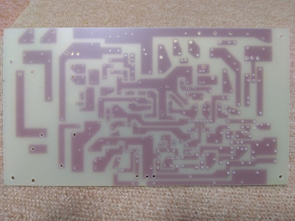 そのために簡易露光機まで作りましたが結果はNG。 太陽光で15分露光してもダメでした。 仕方がないので生基板を1枚購入しいつも通りのパターン切り出し法で製作しました。 基板の材質はガラスコンポジットで、これが一番使いやすいと思います。