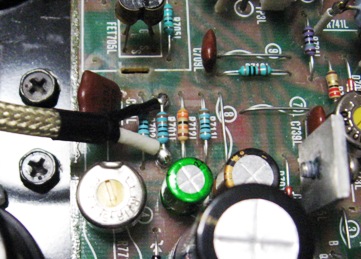 FETの接続も完了しいよいよ入出力の配線をと思ったら、、、、あれまあシールド線が基板にはんだ付けできないではないですか。 FETと接続する前に基板にシールド線を配線しなくてはいけないのを忘れてました。 (大汗)