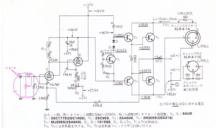 | いよいよ調整に入ります。 記事の手順に従い真空管部分の電圧増幅段の調整を行います。 V2のプレートの配線を調整用に変えて電圧増幅段のDC出力電圧を+87Vとの間で0Vにします。 V1のプレートの抵抗を変えて0V近辺までもっていきます。 何回か交換後ほぼ0Vまで追い込むことができました。 ここまでは順調です。 その後配線を正規に戻し出力段の調整に入ります。 配線完了後にスイッチON。 とその瞬間AC100Vのヒューズが閃光とともに溶断しました。 原因を探るためにいろいろなことを段階的にやってみました。 結果、出力段のバイアス電圧が異常に高いことが分かりました。 これではパワートランジスタが短絡に近い位の電流が流れます。 恐る恐るパワートランジスタをトランジスターチェッカーでチェックしてみるとNPN側はショート状態、PNP側は導通なしでした。 お宝のパワートランジスタの昇天です。 しかし、元々ペアがあまりとれていないものだったのでショックは少ないですが。 その後さらに調べていくとV2に所定の電流が流れていないようです。 V2のバイアスがおかしいのか、トランジスタのバイアス回路がおかしいのか。 パワー段のバイアス用のトランジスタが動作していないようです。 再度一からチェックを始めなくてはいけません。 |