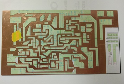 作成したパターンを基に紙フェノールの基板にパターンのマスキングを行いました。 試作基板なので手持ちの粘着シートとパターンを印刷した紙を張り付けパターンをカッターで切り出しました。 この後穴あけとエッチングを行います。   ホームページはこちら mj4018.lsv.jp/9500modoki.html
