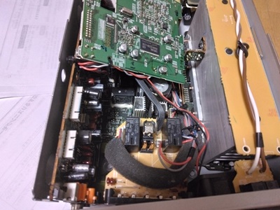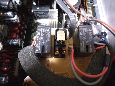 ホームシアターのサラウンドアンプ周りの配線を整理したのでついでに各スピーカーのバランスチェックを行いました。 リモコンのボタン一つで順番にテストトーンが流れてきます。 おや? センターの音が出ていない。 スピーカー端子にコードがよく刺さっていなかったのかと思い接続し直しましたがまだ出ません。 センタースピーカーのレベルと最大近くまで上げると僅かにかすれた音が出てきます。 明らかに接触が悪い感じの症状です。 音量調節は電子ボリュームなので接触と言ったらリレー位しか考えられません。 分解しようと天板を取ると中には綿埃がたっぷり積もっています。 中古で購入した後中は確認しなかったのを反省。 冷却用のファンで空気を取り込んでおり、まして床に直置きだったでしょうからほこりも溜まるはずです。 外に持っていきエアーコンプレッサーで隅々まで帆ころを吹き飛ばしてやりました。 リアパネルと基板を外してリレーにアクセス。 半田を取り去りリレーを外さないといけないかと思いましたが、センタースピーカーのリレーだけ、カバーを引っ張ったら簡単に外れました。 接点をテスターで測ると明らかに接触不良です。 接点の清掃を行い再びテスターで測ると見事復活です。